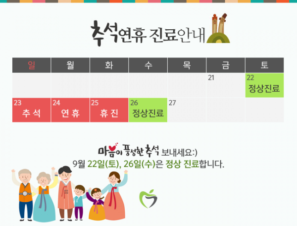 목록 2018년 추석연휴 진료안내 작성자 미소탑 작성일 18-09-19 12:29 | 조회 6,449 | 댓글 0 본문 9월 22일(토), 26일(수)은 정상 진료합니다. 참고하시어 진료에 불편이 없으시길 바랍니다. 이전글다음글 댓글목록 0 등록된 댓글이 없습니다. 목록