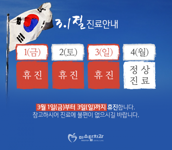 목록 2019년 3월 진료안내 작성자 미소탑 작성일 19-02-26 18:05 | 조회 6,569 | 댓글 0 본문 3월 1일(금)부터 3일(일)까지 휴진합니다. 4일부터 정상 진료합니다. 참고하시어 진료에 불편이 없으시길 바랍니다. 이전글다음글 댓글목록 0 등록된 댓글이 없습니다. 목록