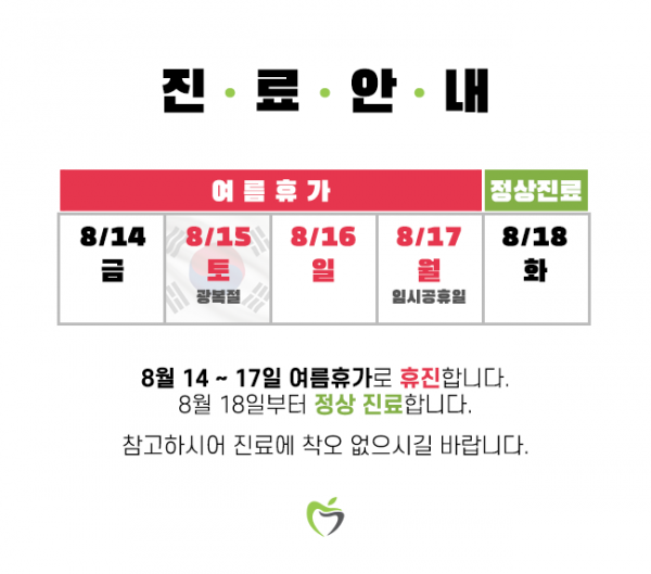 8월 14 ~ 17일 여름휴가로 휴진합니다.